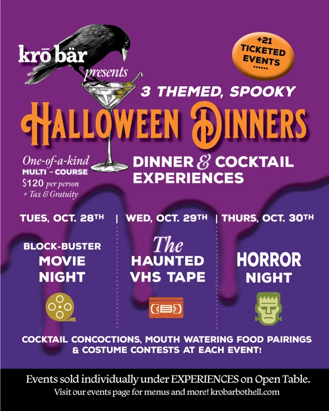 Kro Bar Bothell is so excited to announce some spooky and delicious events that we think you'll definitely want to.... Sink your teeth into... Mwahahahah!