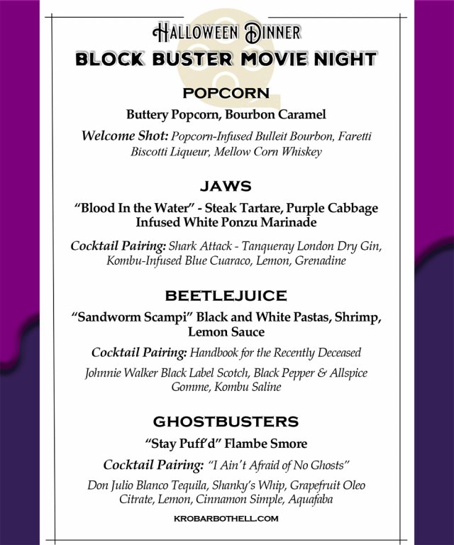 Tuesday, Oct 28th - Blockbuster Movie Night - This dinner event is themed to some of your favorite box-office films to watch during this time of year. "I Ain't Afraid of No Ghosts!"